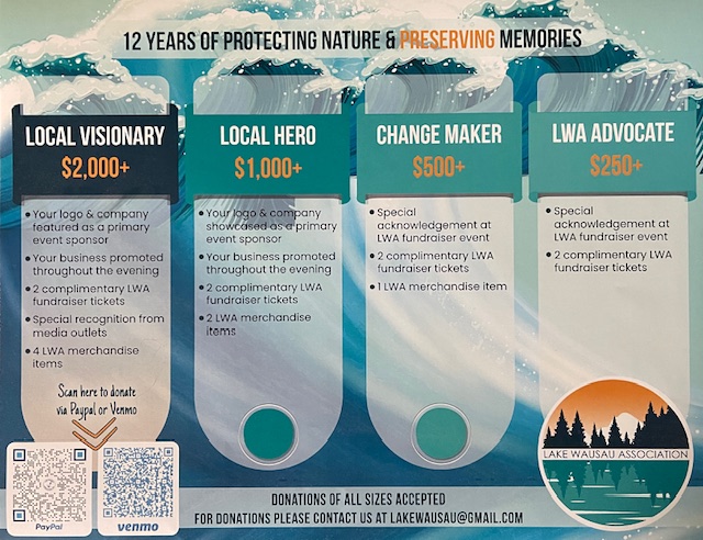 All donations fund Lake Wausau improvements and management efforts. Recent & current projects and initiatives to improve Lake Wausau requiring funding and donations include the purchase and installation of an ADA compliant kayak launch to enhance recreational opportunities, installation of no wake buoys to promote safety and preservation of shorelines, education on safe recreating and wakesurfing, support of volunteer programs like Adopt-A-Shoreline, and weed harvesting and potential dredging to maintain navigable channels and prevent the spread of invasive species. Our group is entirely volunteer and no donations or fundraiser proceeds are used to compensate any member of the organization. We are working toward a better Lake Wausau for everyone in our community to enjoy!